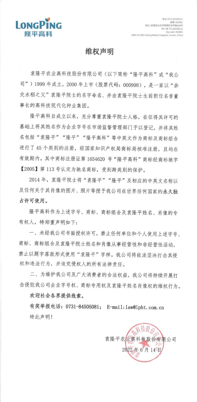 隆平高科企業(yè)字號權(quán)、商標(biāo)專用權(quán)及袁隆平姓名肖像權(quán)維權(quán)聲明