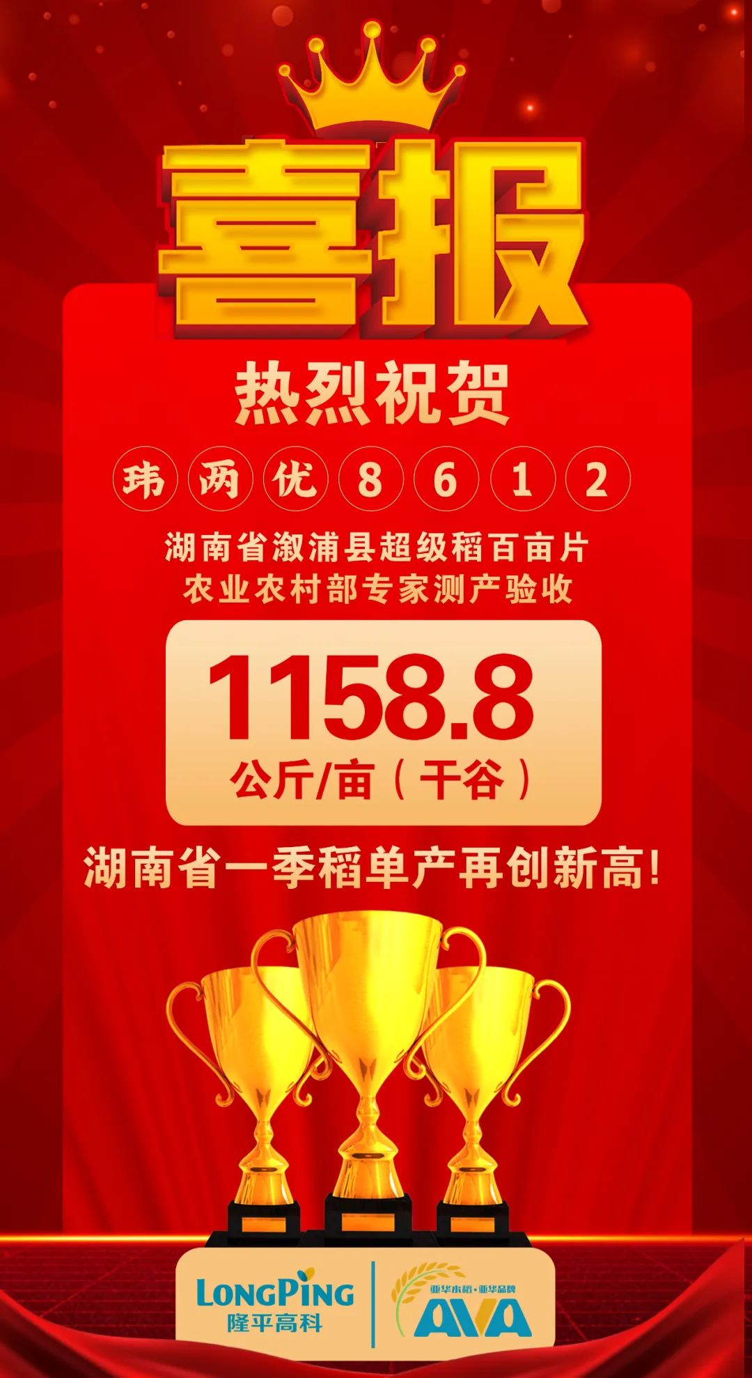 2021年,瑋兩優(yōu)8612在隆回縣羊古坳鎮(zhèn)農(nóng)業(yè)農(nóng)村部超級稻百畝示范片測產(chǎn)畝產(chǎn)干谷為1114.8公斤,創(chuàng)造湖南省一季稻高產(chǎn)紀(jì)錄,并被收錄于央視《種子 種子》紀(jì)錄片。近兩年瑋兩優(yōu)8612推廣面積超過150萬畝,實際增產(chǎn)超過1.5億公斤,為農(nóng)戶增收3億元以上,積極響應(yīng)了中央“藏糧于技”的國家糧食安全戰(zhàn)略,為保障國家糧食安全、農(nóng)戶增收作出應(yīng)盡貢獻(xiàn)。