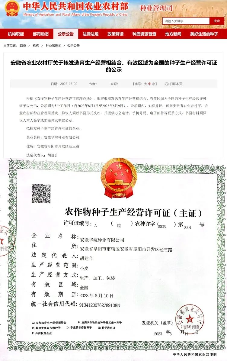 近日,安徽省農(nóng)業(yè)農(nóng)村廳發(fā)布《關(guān)于核發(fā)選育生產(chǎn)經(jīng)營相結(jié)合、有效區(qū)域?yàn)槿珖姆N子生產(chǎn)經(jīng)營許可證的公示》,現(xiàn)公示期結(jié)束,安徽華皖正式獲得種子生產(chǎn)經(jīng)營許可證(A證),這表明公司已成為國內(nèi)為數(shù)不多的專營小麥種子的國家級育繁推一體化企業(yè)。