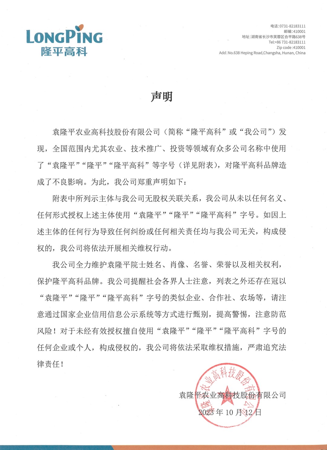 關(guān)于不法分子假冒隆平高科名義行騙的嚴正聲明