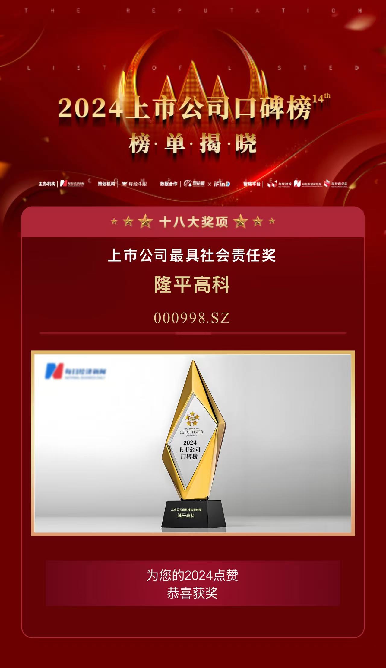 12月5日-6日,由中國上市公司協(xié)會等單位指導,每日經(jīng)濟新聞主辦的2024第十三屆中國上市公司高峰論壇在成都舉行,400多家上市公司齊聚蓉城,共襄“壯大耐心資本·賦能新質(zhì)生產(chǎn)力發(fā)展”主題盛宴。6日晚,第十四屆中國上市公司口碑榜揭曉,憑借在貫徹落實糧食安全戰(zhàn)略、傳播先進農(nóng)業(yè)技術(shù)等方面的實踐成果,隆平高科榮獲上市公司最具社會責任獎。