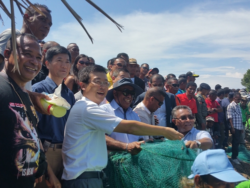 駐東帝汶使館臨時(shí)代辦李繁杰,東帝汶總理阿勞若,農(nóng)業(yè)部長(zhǎng)埃斯塔尼斯,副部長(zhǎng)達(dá)科斯塔用捕撈桿收獲首批鮮蝦