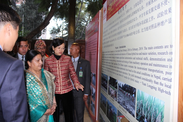 觀看完文藝演出后,比迪婭·班達里在于紅的陪同下饒有興致地參觀了中國援助尼泊爾項目展覽區(qū)。當(dāng)比迪婭·班達里來到隆平高科援尼泊爾農(nóng)業(yè)技術(shù)合作項目的展板前時,于紅向她介紹說:今年中國雜交水稻在尼泊爾三個地方進行試驗,都表現(xiàn)優(yōu)秀,單位產(chǎn)量在6.8-8.7噸/公頃,與當(dāng)?shù)貙φ掌贩N比較增產(chǎn)效果十分顯著。比迪婭·班達里聽后十分高興,指著展板上的水稻圖片說:這個水稻看上去就與我們的品種不一樣,穗子長、大,谷粒多,產(chǎn)量肯定會高,我國的水稻產(chǎn)量低、糧食緊缺、依賴進口,就是要大力推廣中國的雜交水稻,促進雜交水稻技術(shù)在尼泊爾發(fā)展,提高糧食產(chǎn)量,以解決糧食自給自足的問題。