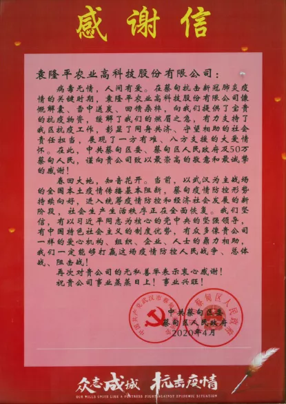 感謝信表示:“在蔡甸抗擊新冠肺炎疫情的關(guān)鍵時期,袁隆平農(nóng)業(yè)高科技股份有限公司慷慨解囊、雪中送炭、回饋桑枝,向我們提供了寶貴的抗疫物資,緩解了我們的燃眉之急,有力支持了我區(qū)抗疫工作,彰顯了同舟共濟、守望相助的社會責(zé)任擔(dān)當,展現(xiàn)了一方有難、八方支援的大愛情懷。在此,中共蔡甸區(qū)委、蔡甸區(qū)人民政府及50萬蔡甸人民,謹向貴公司致以最崇高的敬意和最誠摯的感謝!”